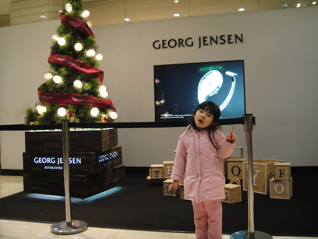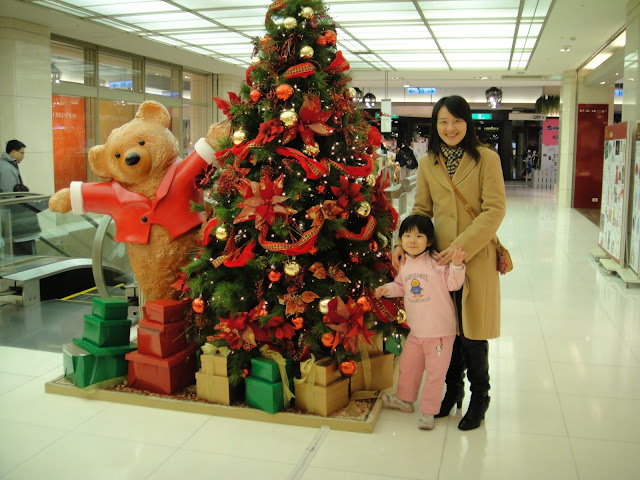 隔天晚上到新光三月吃晚餐並且和聖誕樹聖誕熊照相,波波high到不行,